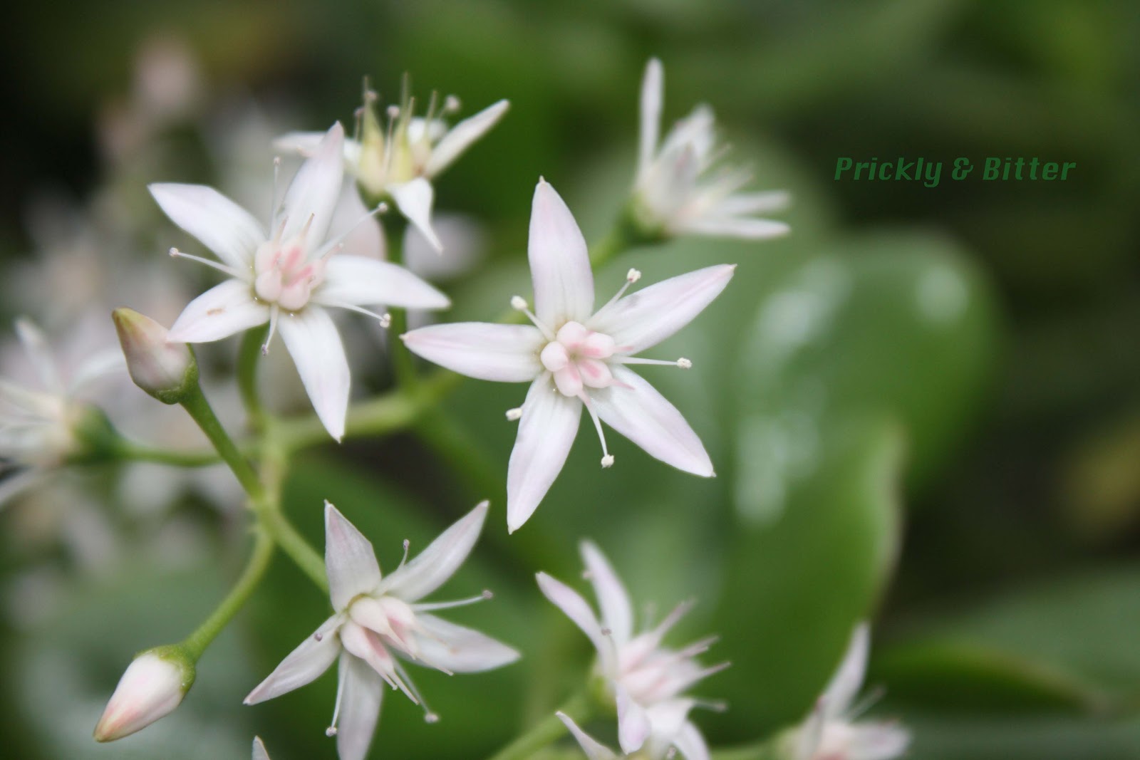 This jade plant has been masterfully cared for. How do I know this? Look at all the flowers! I've seen the odd flower or inflorescence group on a jade plant before, but nothing like this. One thing that you often have to be careful of when it comes to flowering plants (and some non-flowering plants that are gymnosperms) is that when they "moult" because their health is suffering, it's often mistaken for a sign of great health and prosperity. Some trees are known to do this: the tree somehow knows that it is infected with some kind of disease (insect, fungal, bacterial or viral), produces significantly more seeds than it would under normal conditions, then dies pretty quickly after the big seed flush. Oak trees also do this on an incredibly predictable cycle, which is off-set with population booms of squirrels. When the squirrel population is high, the oak trees need to produce an over-abundance of acorns just to keep up. They moult and over-produce acorns in an effort to overwhelm the squirrels and hopefully reproduce instead of being completely eaten. The results of this effort can sound like it's literally raining acorns. This effort seems to be incredibly successful, since most species of oak aren't at risk of becoming endangered due to squirrel predation any time soon. The moulting of oak trees depends on the species; red oaks are on a 4-5 year cycle and white oaks a 5-7 year cycle. Is this jade plant at risk of keeling over after this flush of flowers? I'm guessing not, but I'm really not sure. If it's mysteriously absent from the greenhouse in 8-12 months, then I think I know why! If it's still there, then its just a well-loved jade plant.